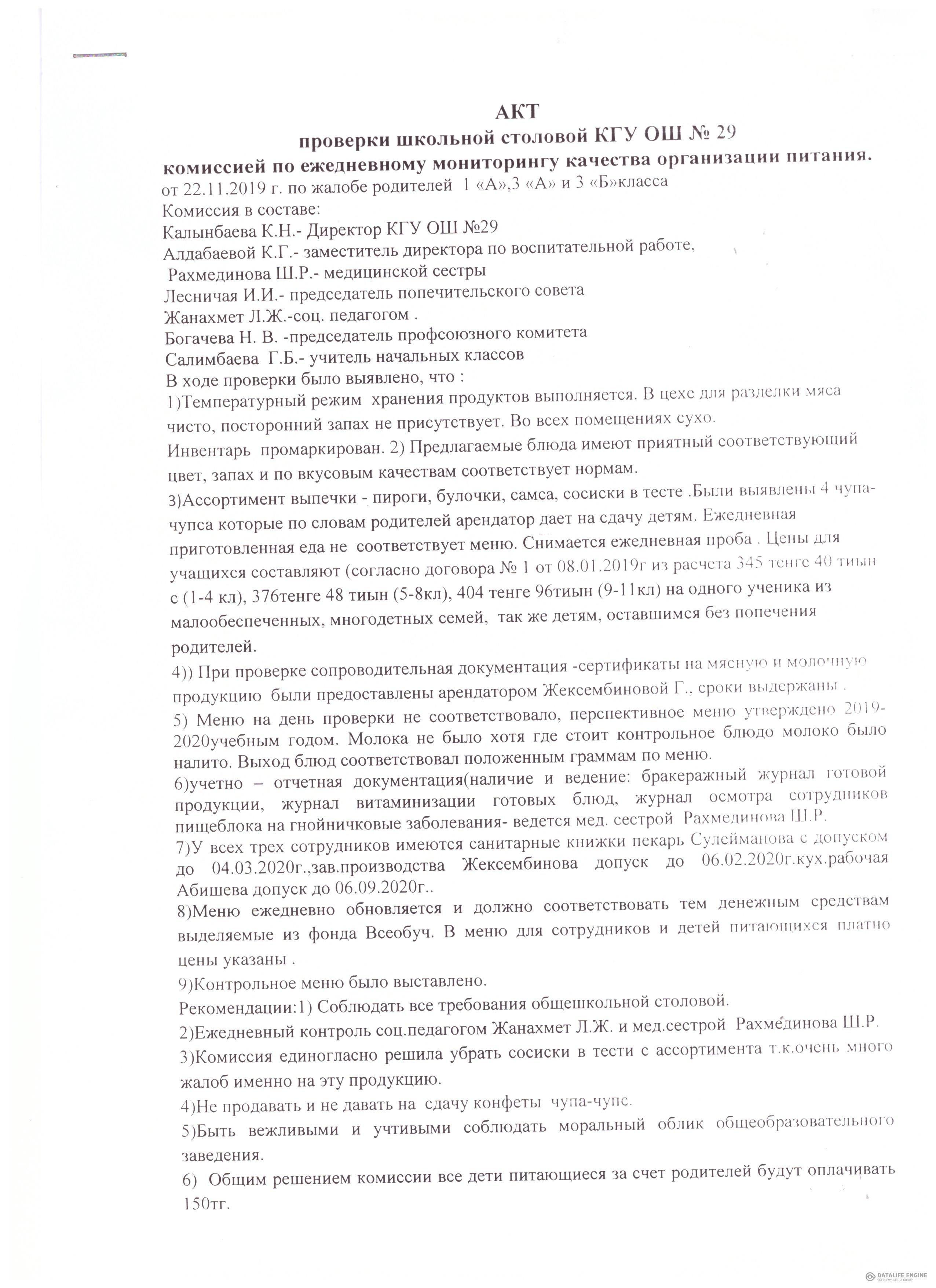 22 қараша 2019 0 1 2 3 4 5 АКТ проверки школьной столовой КГУ ОШ №29 комиссией по ежемесячному мониторингу качества организации питания