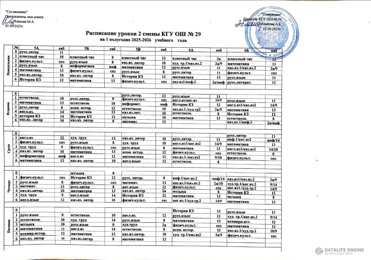2025–2026 жаңа оқу жылын ұйымдастыру аясында мектепте сабақ кестесі бекітілді.