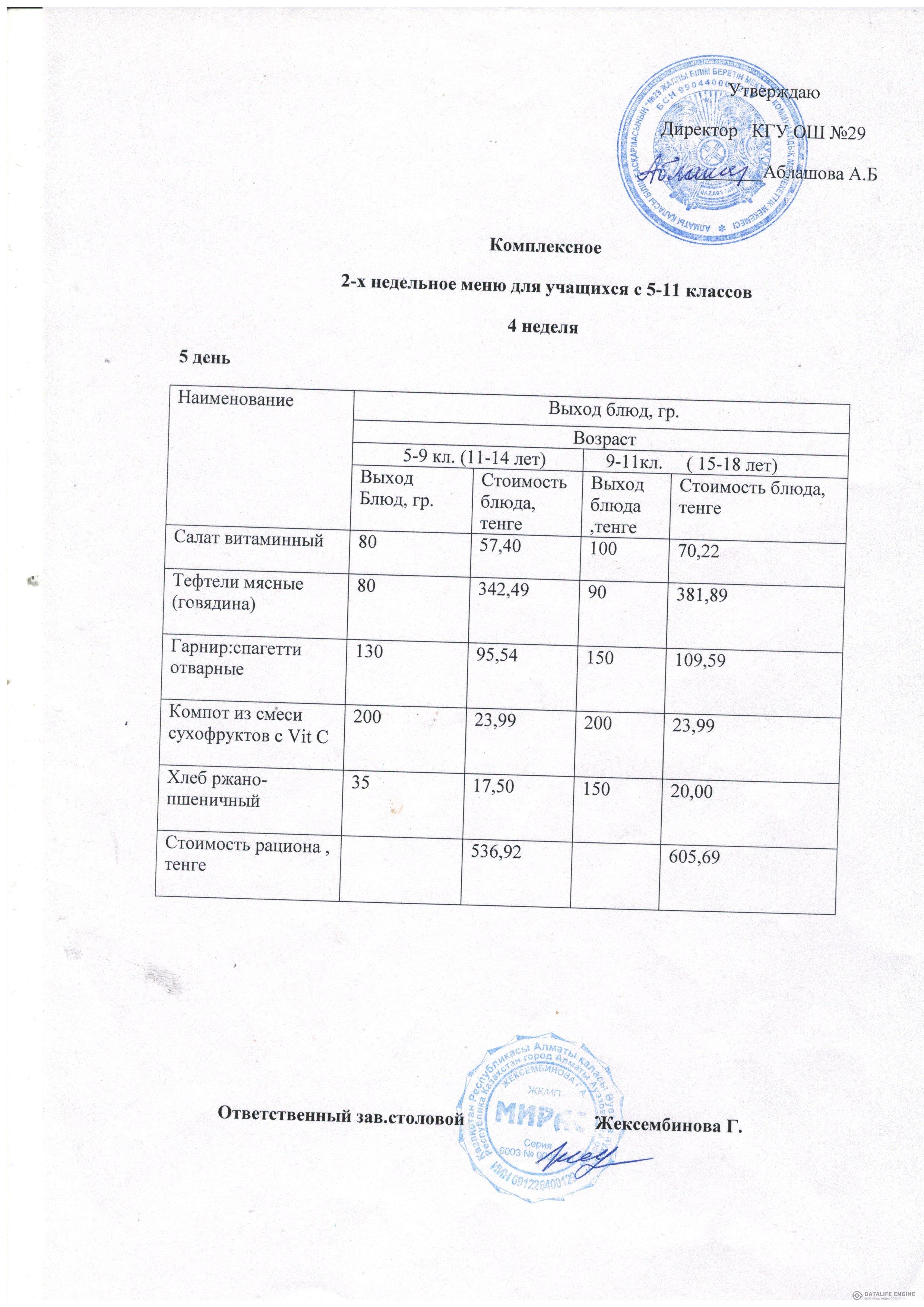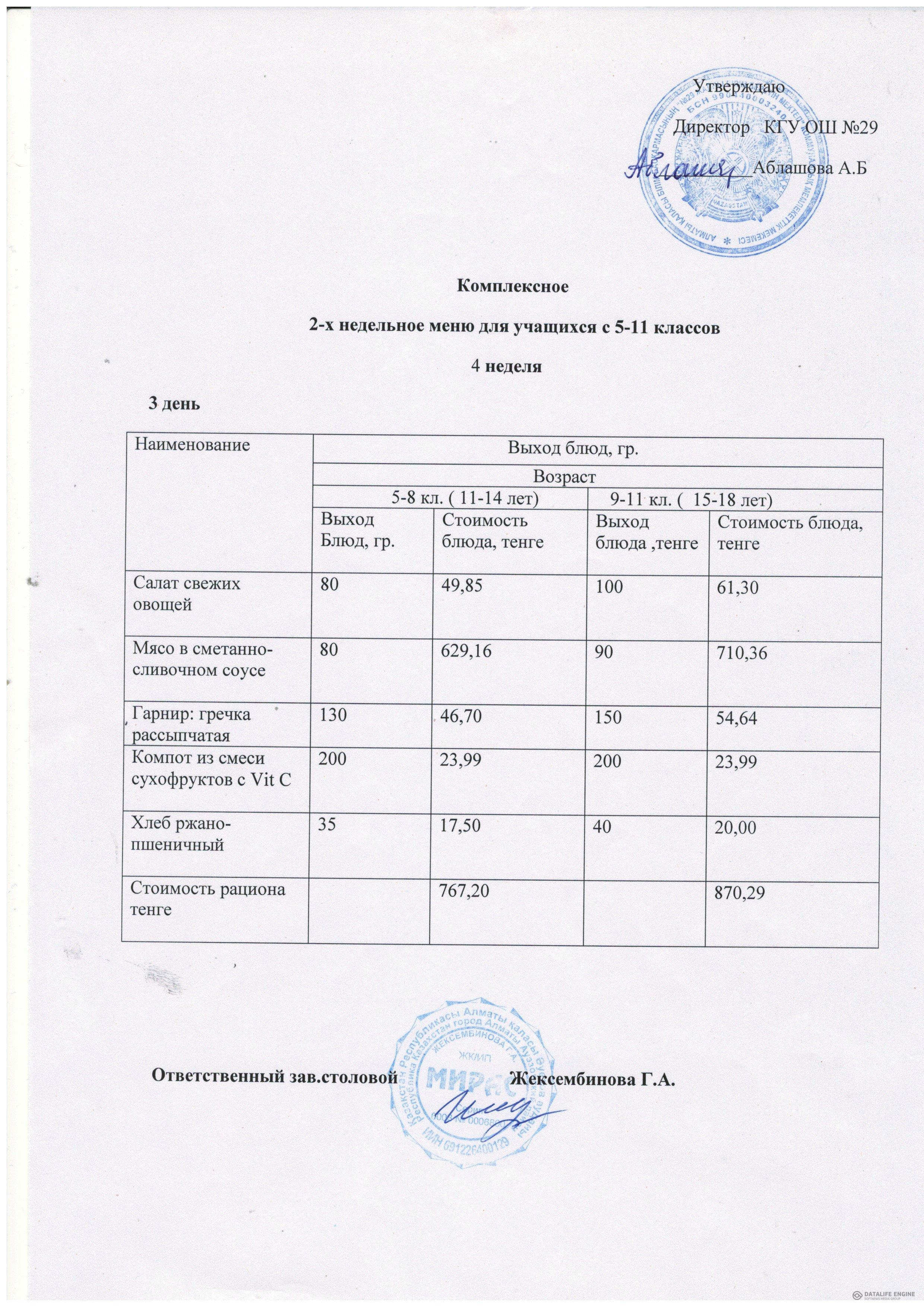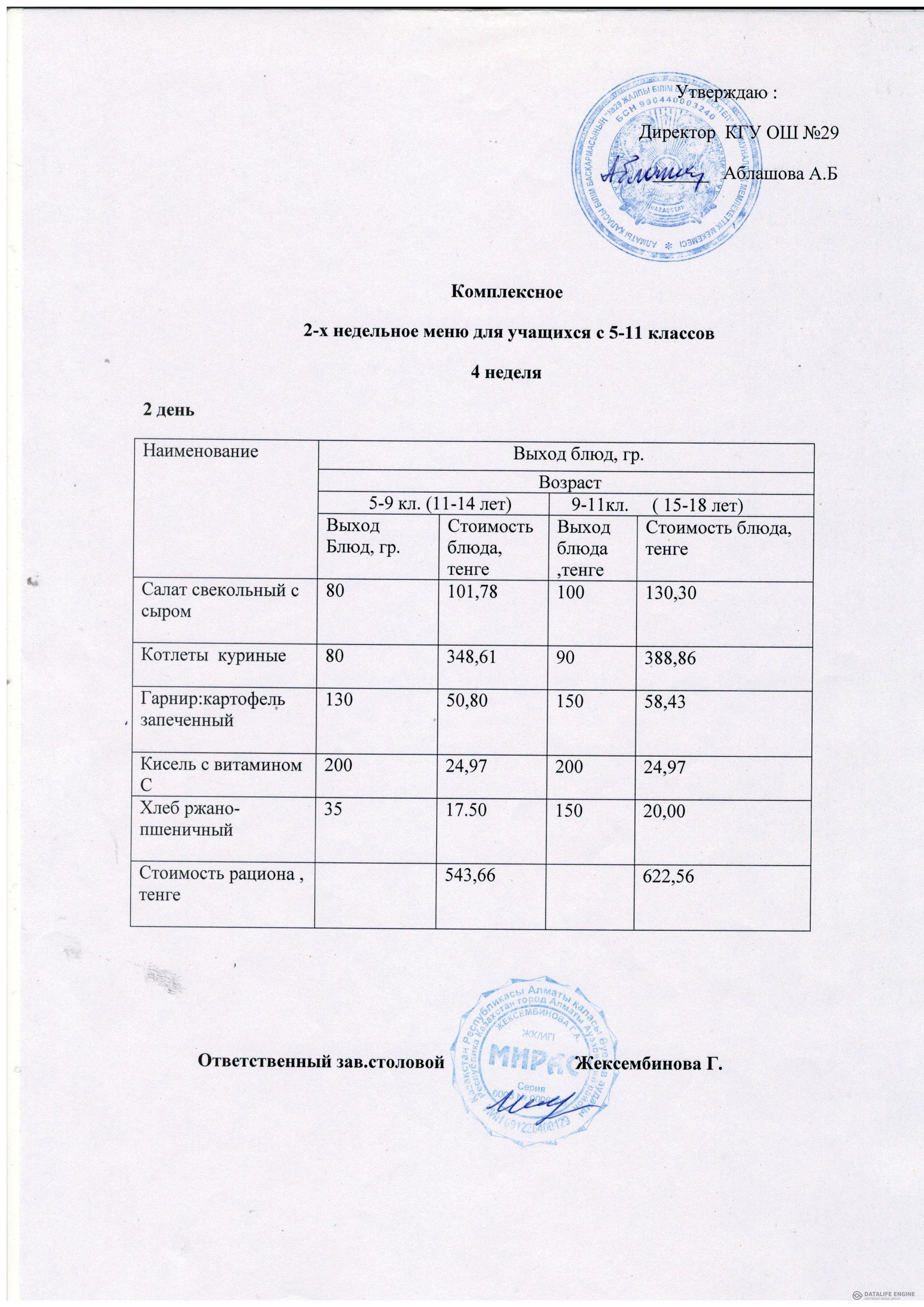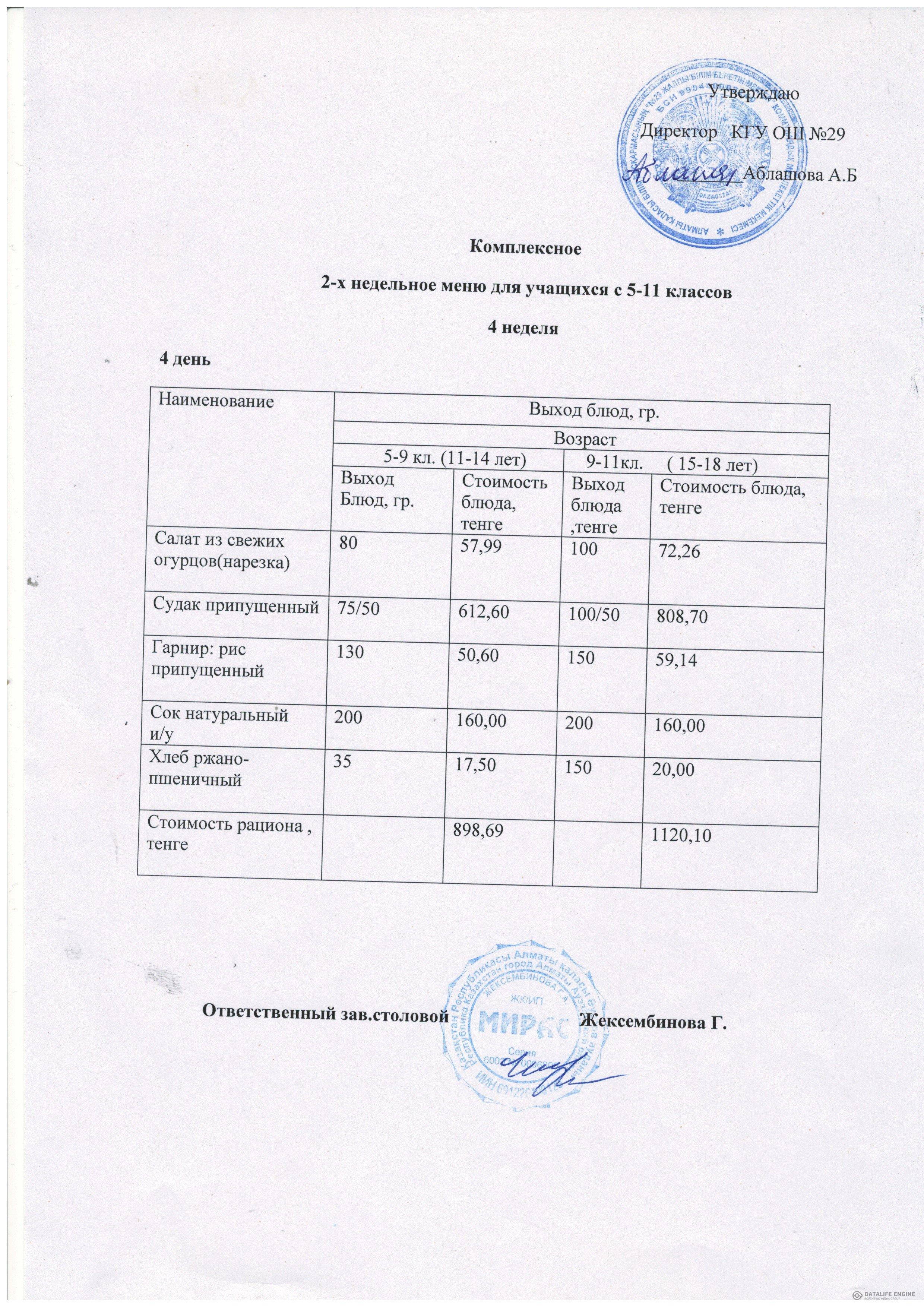 Тегін тамақтану бастауыш 1-4 сыныптарға арналған төрт апталық ас мәзірі