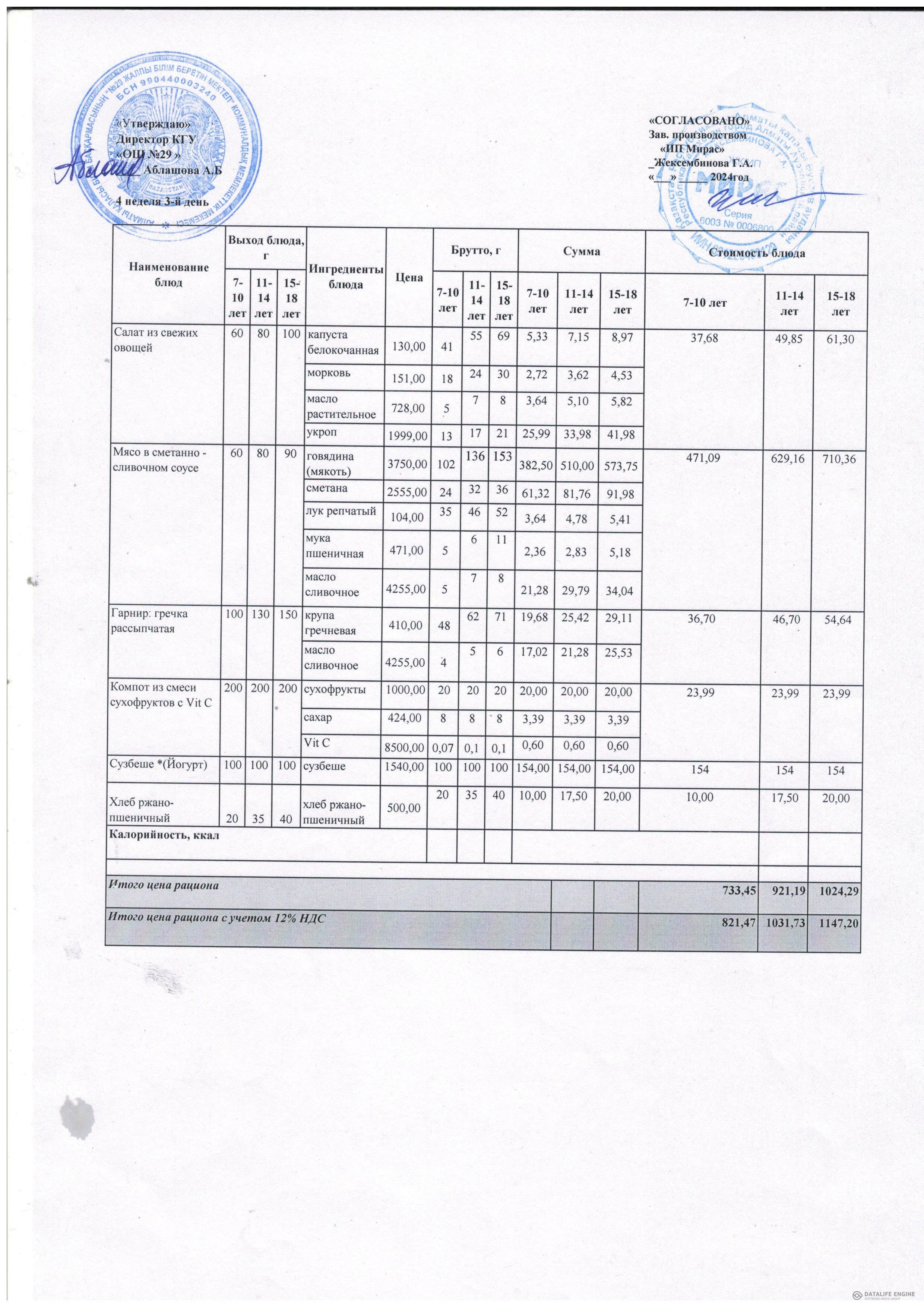 Ас мәзірі мектепішілік лагерь 1-4 сынытар/Меню пришкольного лагеря 1-4 классы