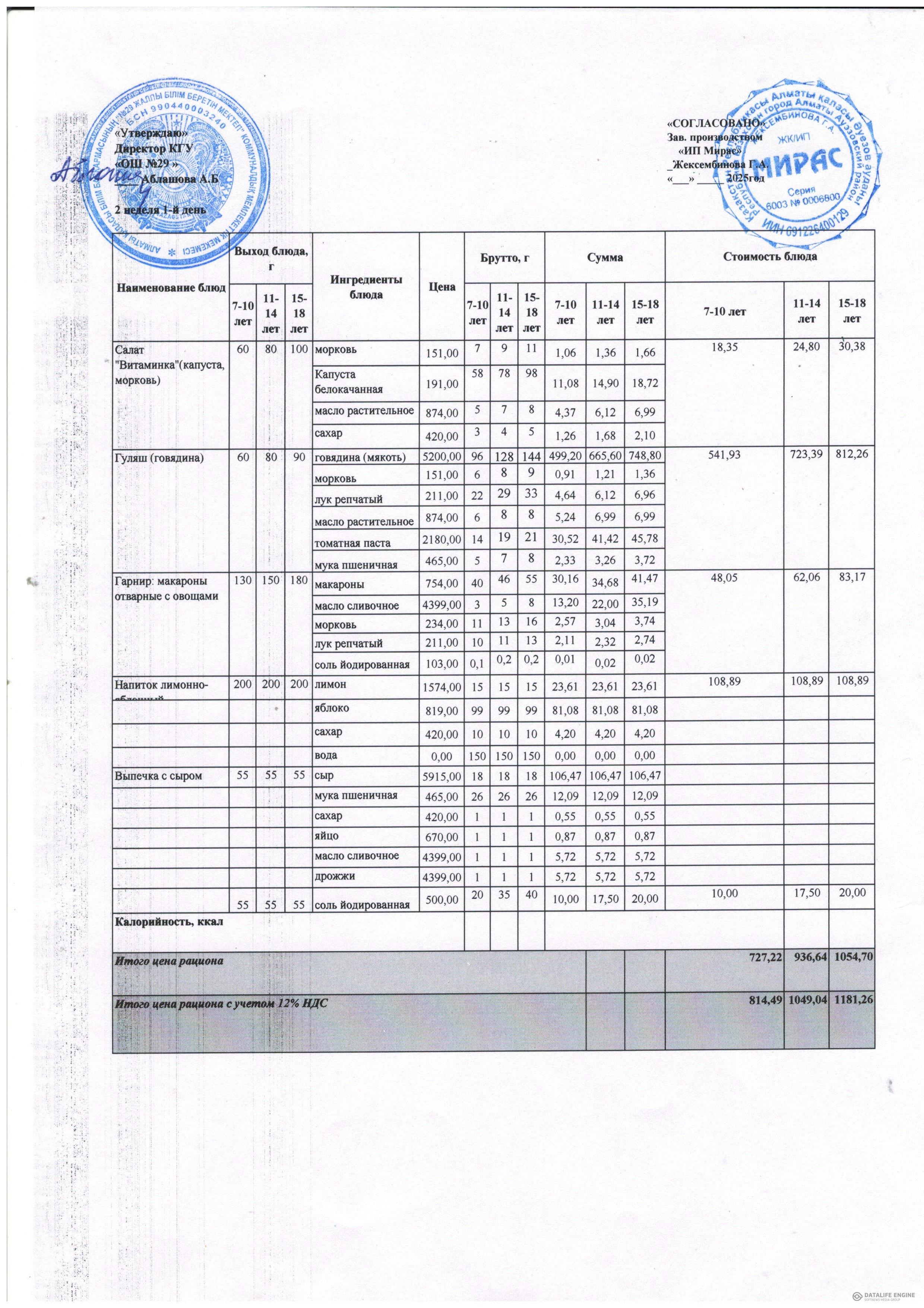 Ас мәзірі 1-4 сыныптар/ Меню 1-4 классы