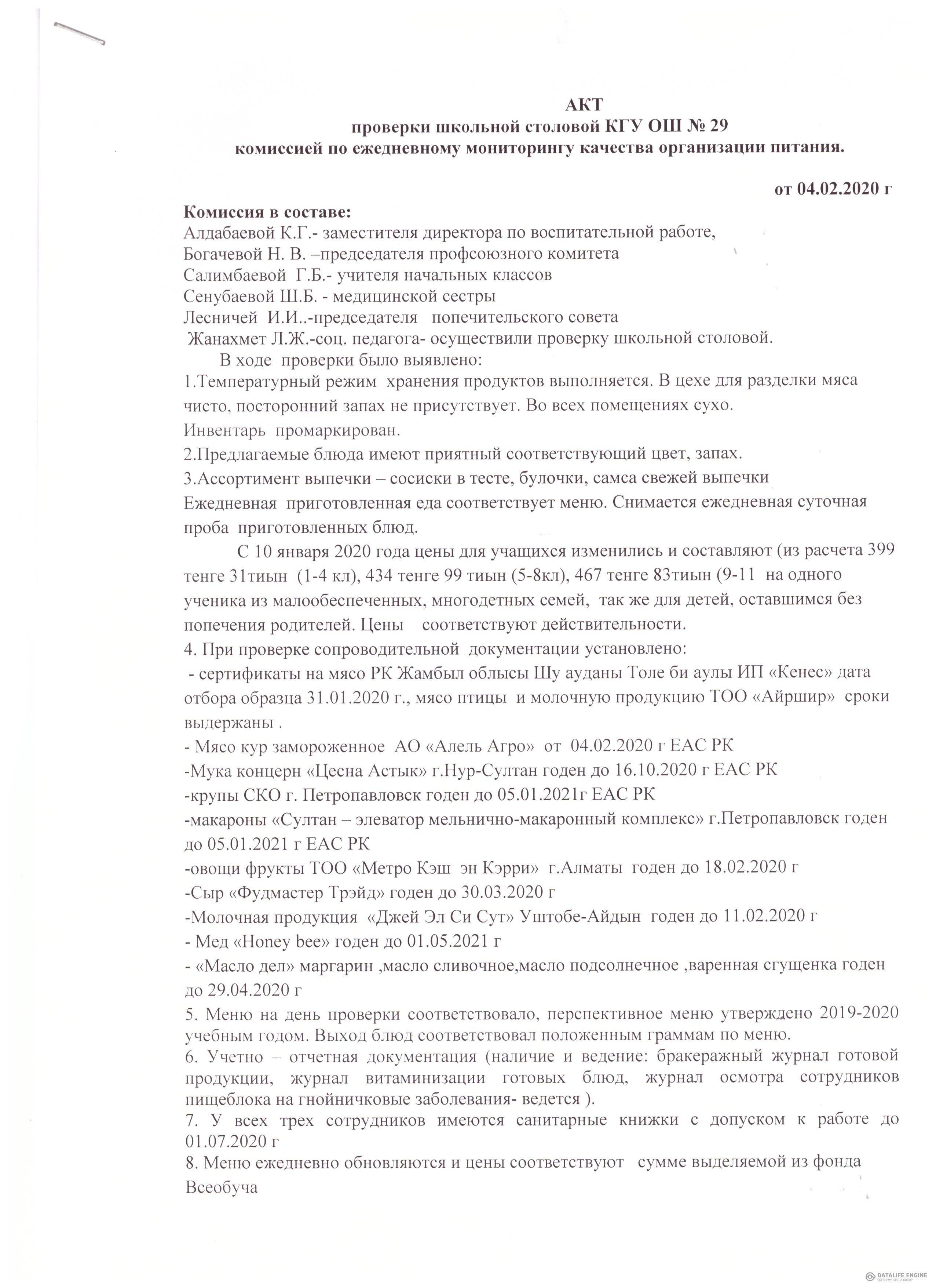 Тамақтандыруды ұйымдастыру сапасының ай сайынғы мониторингі жөніндегі комиссияның № 29 ЖББМ КММ мектеп асханасын тексеру актісі 04.02.2020 ж. / АКТ проверки школьной столовой КГУ ОШ №29 комиссией по ежемесячному мониторингу качества организации питания 04