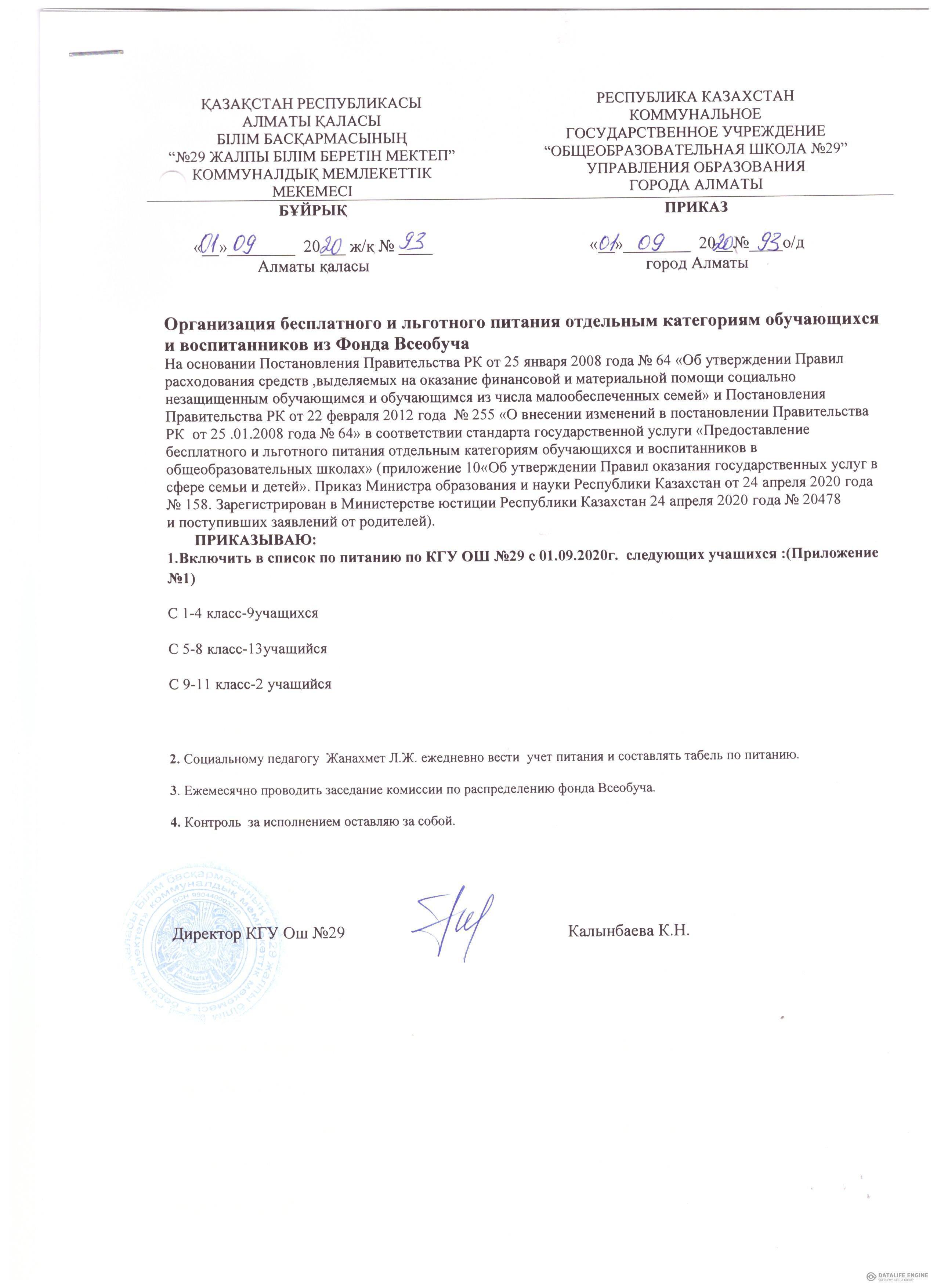 КГУ ОШ№29 » Тамақтандыру » Сапалық мониторинг » "Жалпыға бірдей білім беру қорынан білім алушылар мен тәрбиеленушілердің жекелеген санаттарына тегін және жеңілдікпен тамақтандыруды ұйымдастыру" туралы №93 бұйрық / Приказ №93 об "Организации бесплатного и льготного питания отдельным категориям обучаю