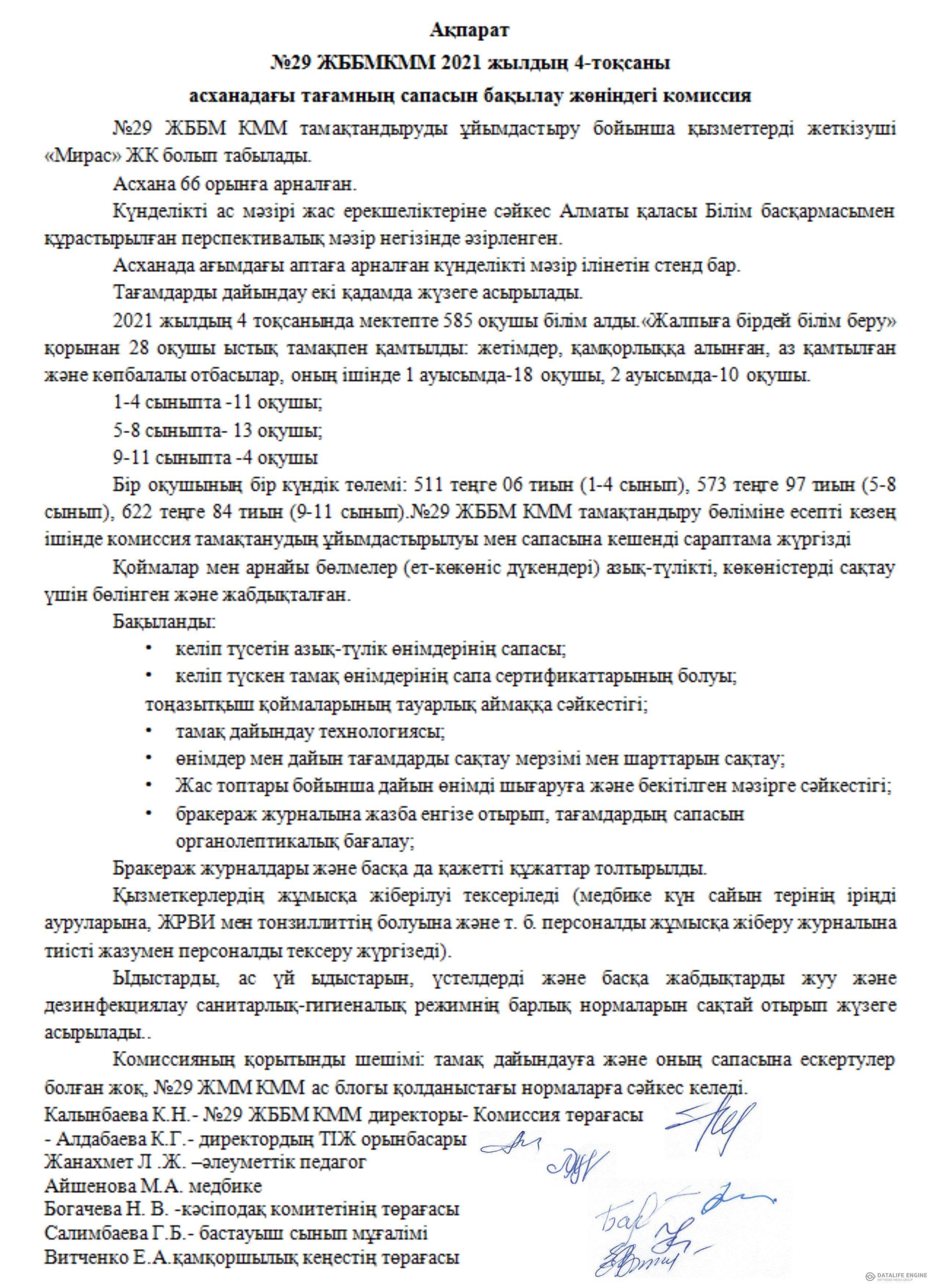 №29 ЖББМ КММ 4 шаршы метр асханада тамақтану сапасына мониторинг жүргізу жөніндегі комиссияның ақпараты / Информация комиссии по мониторингу за качеством питания в столовой за 4 кв. КГУ ОШ №29