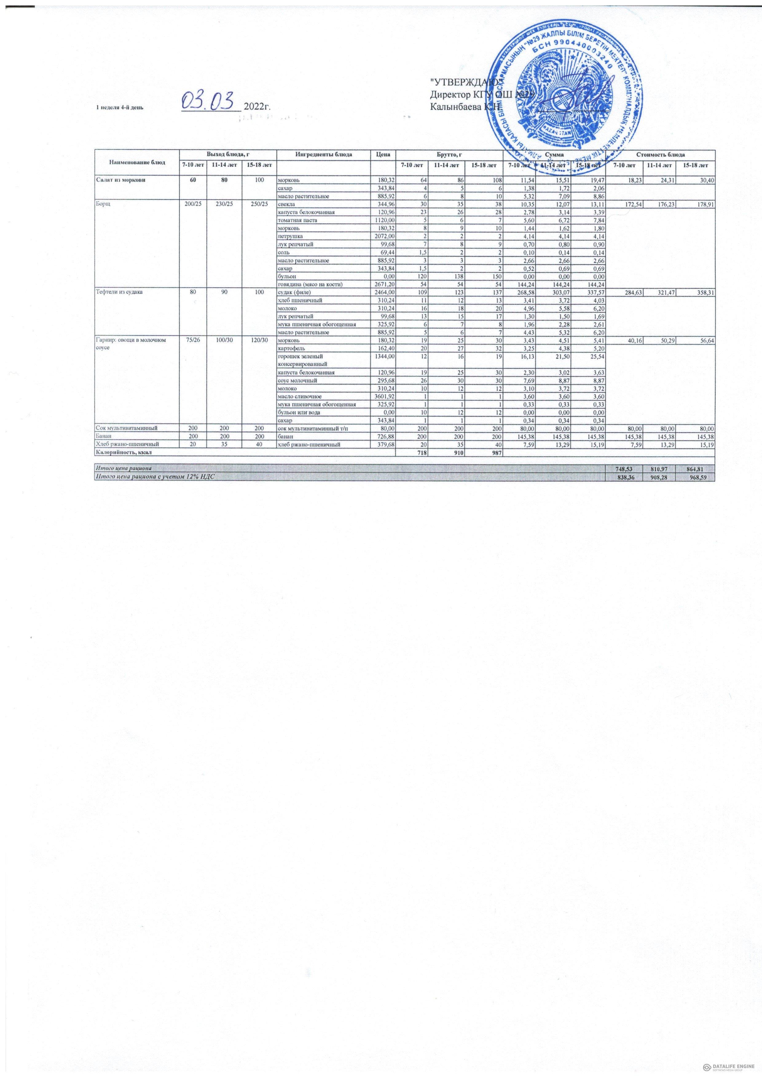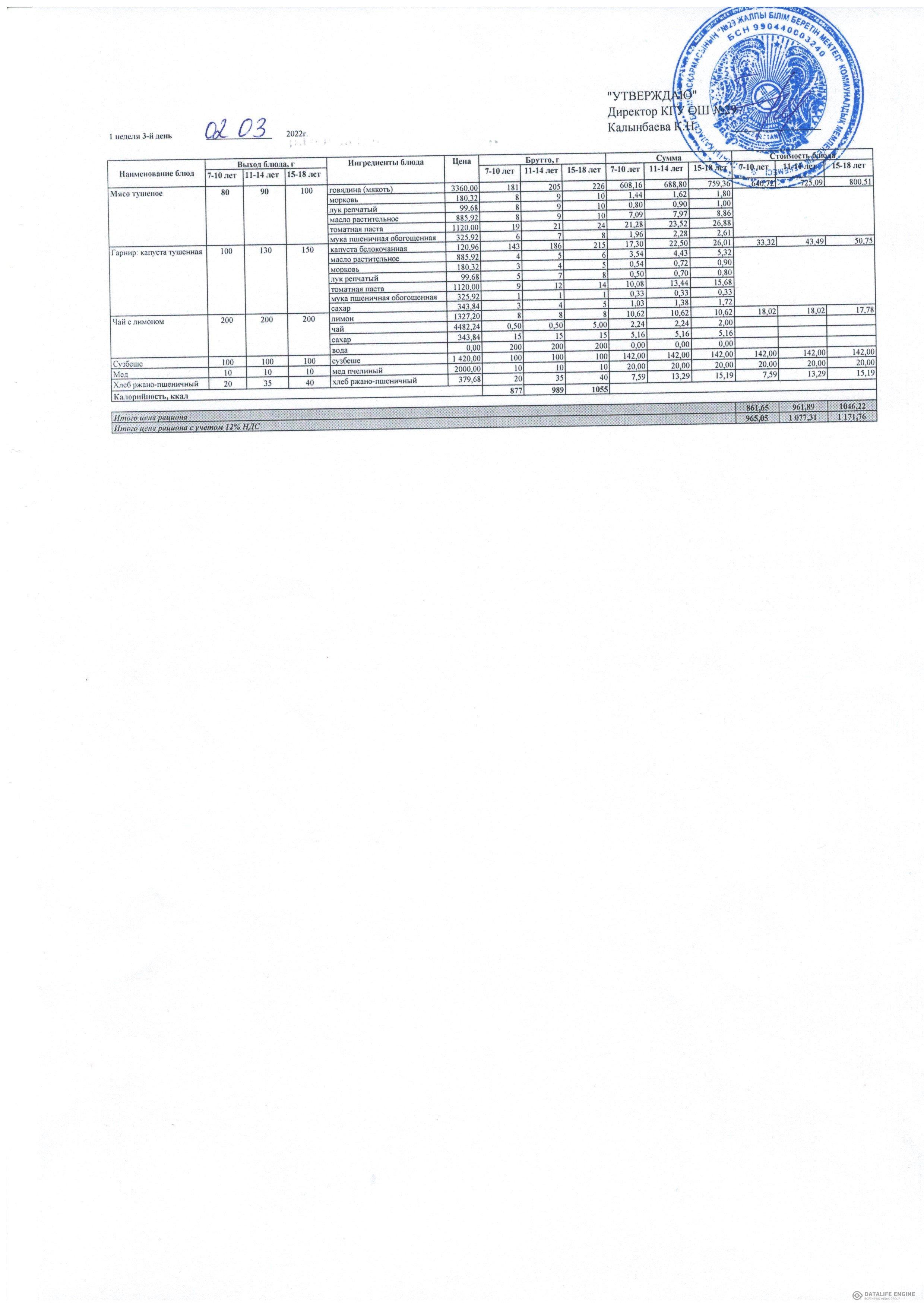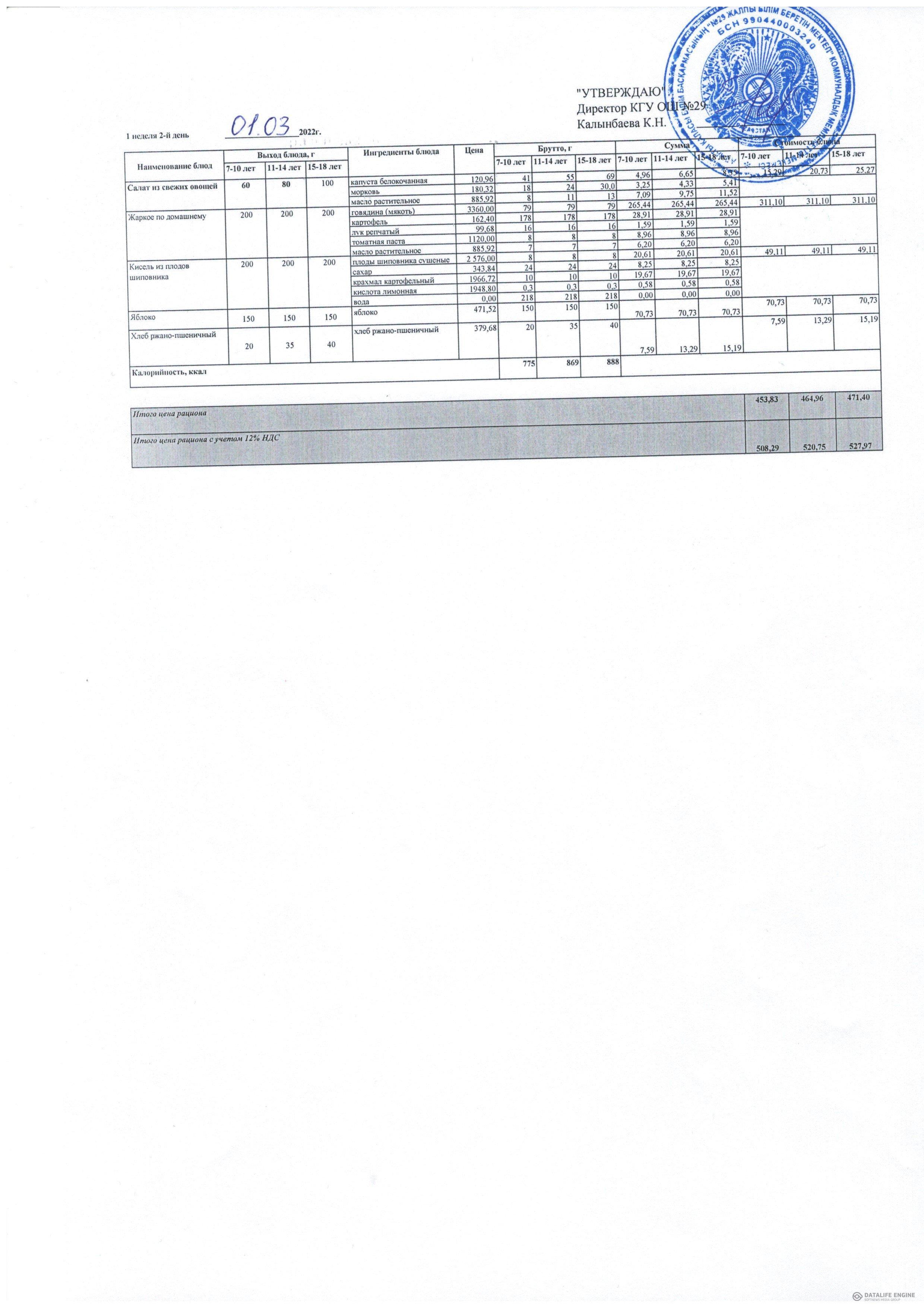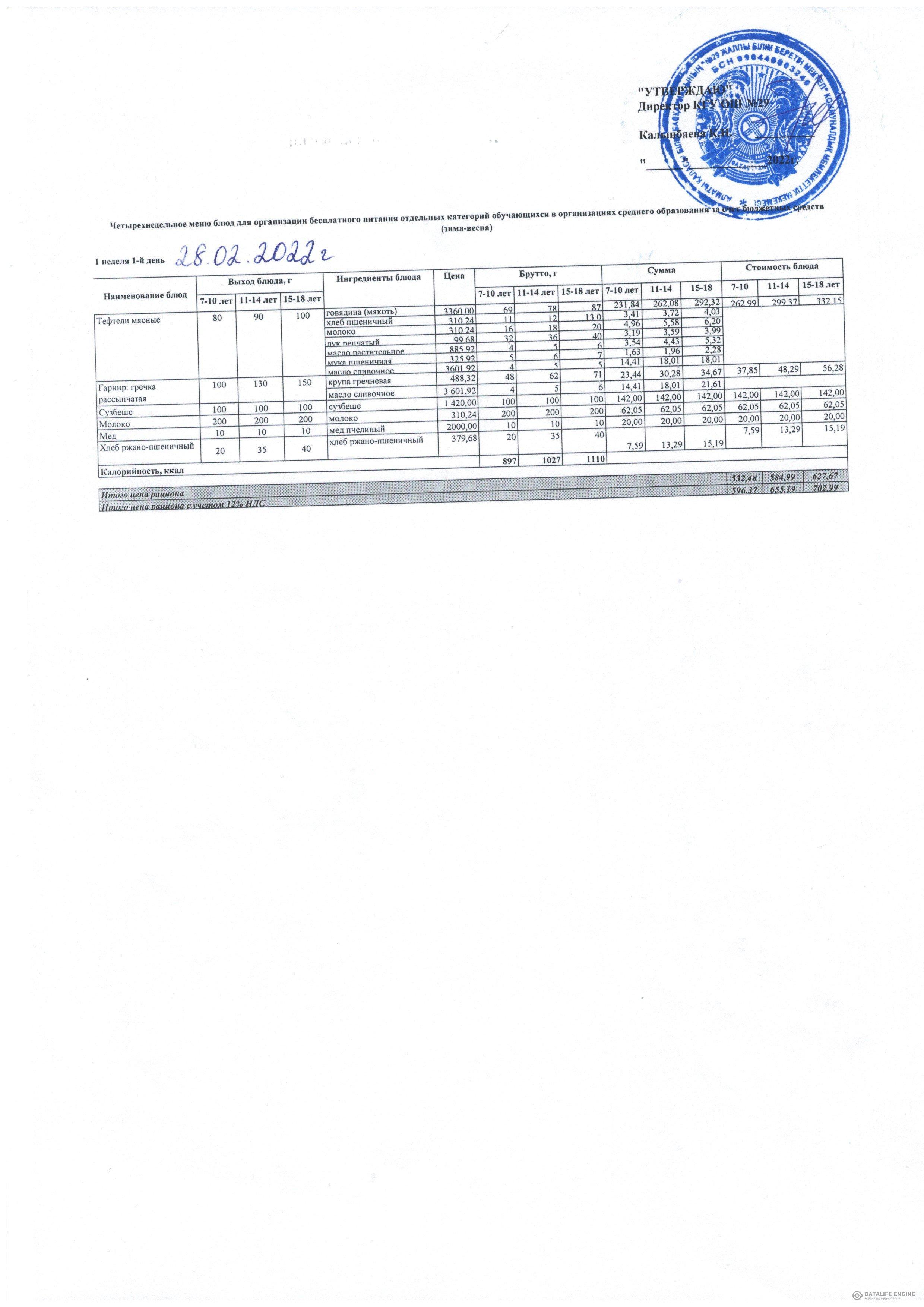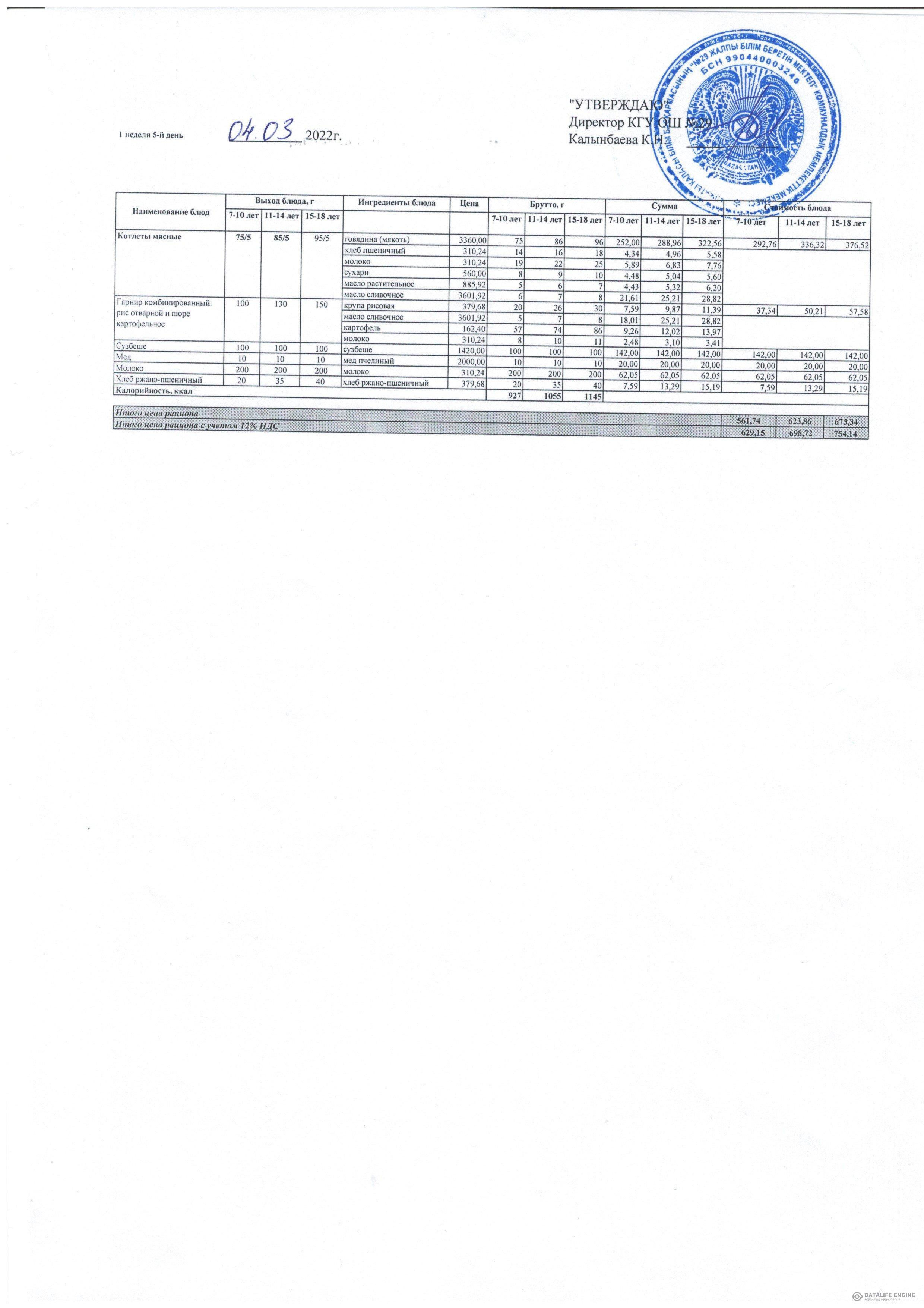 2022 жылдың қыс-көктем мәзірі жалпы білім беру қоры есебінен тамақтанатын оқушылар.1 апта 03.22 жыл / Меню зима-весна 2022 г. учащихся питающихся за счет фонда Всеобуч.1 неделя 03.22 года